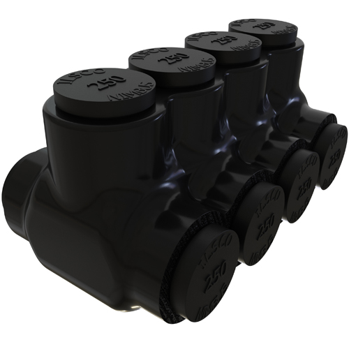 Single Sided Entry Insulated Multi-Tap Connector, #14 Awg (Stranded) Conductor Size, 1/0 Awg (Stranded) Conductor Size, Insulated, Plastisol Insulation Material, Copper/Aluminum Conductor Material, Black Insulation Color, 3 Conductors, -45 °C Operating Temperature, +90 °C Operating Temperature, 1.50 In Overall Length, 600 V, 0.19 LB/Ea